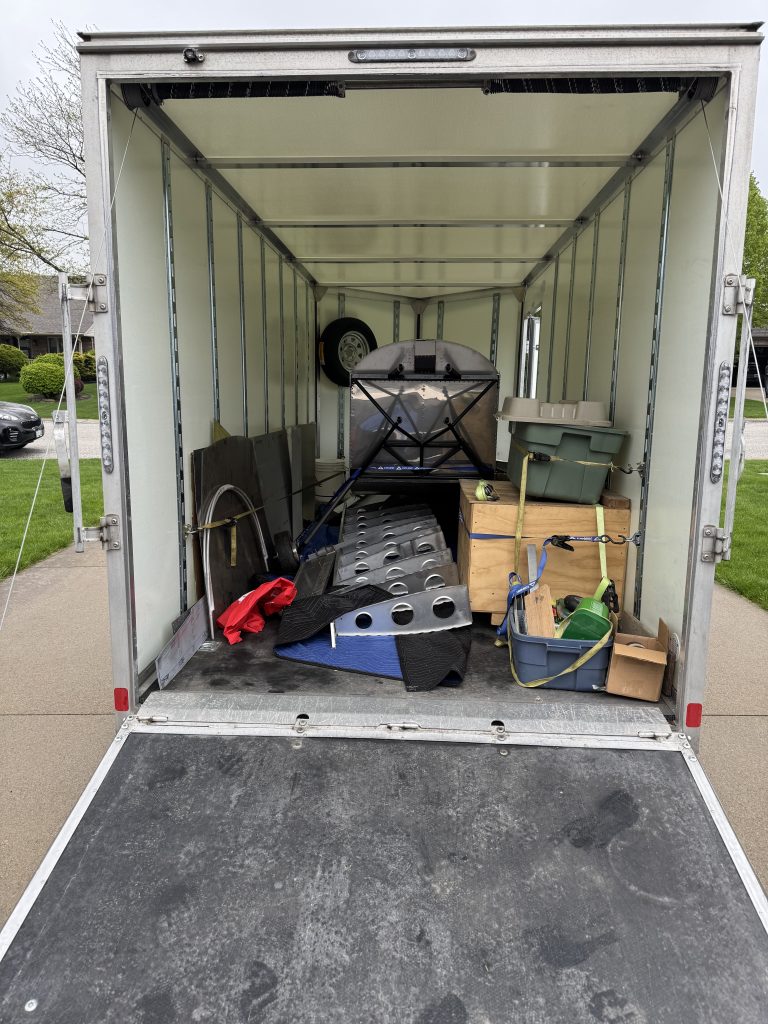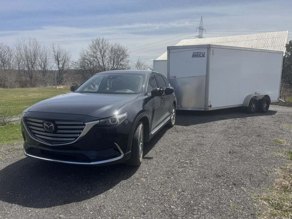 I found a guy renting trailers locally and he had a 16′ available with a ramp door. Perfect! I booked it for the first weekend in May, way back in February, and decided to tow it with my parents-in-law’s 2019 Mazda CX9. I would need a helper, as the seller, James, is 80 years old, so my dad volunteered to fly in that weekend.